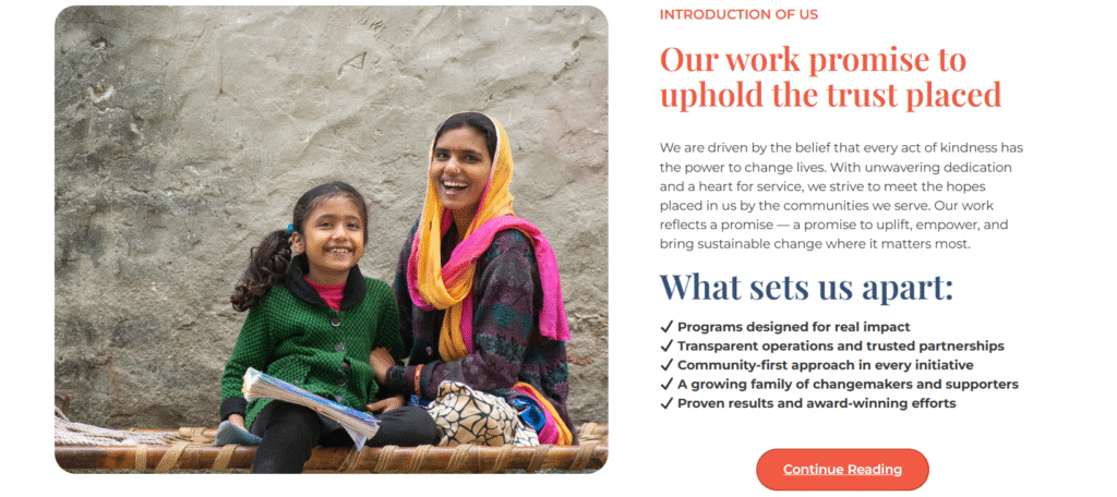 हम शिक्षा सामग्री वितरण, महिलाओं के लिए सिलाई-प्रशिक्षण,कौशल विकास महिला सशक्तिकरण ,पर्यावरण,साफ पानी नि:शुल्क स्वास्थ्य शिविर, बच्चों को छात्रवृत्ति, और ग्रामीण विकास परियोजनाएँ चला रहे हैं।